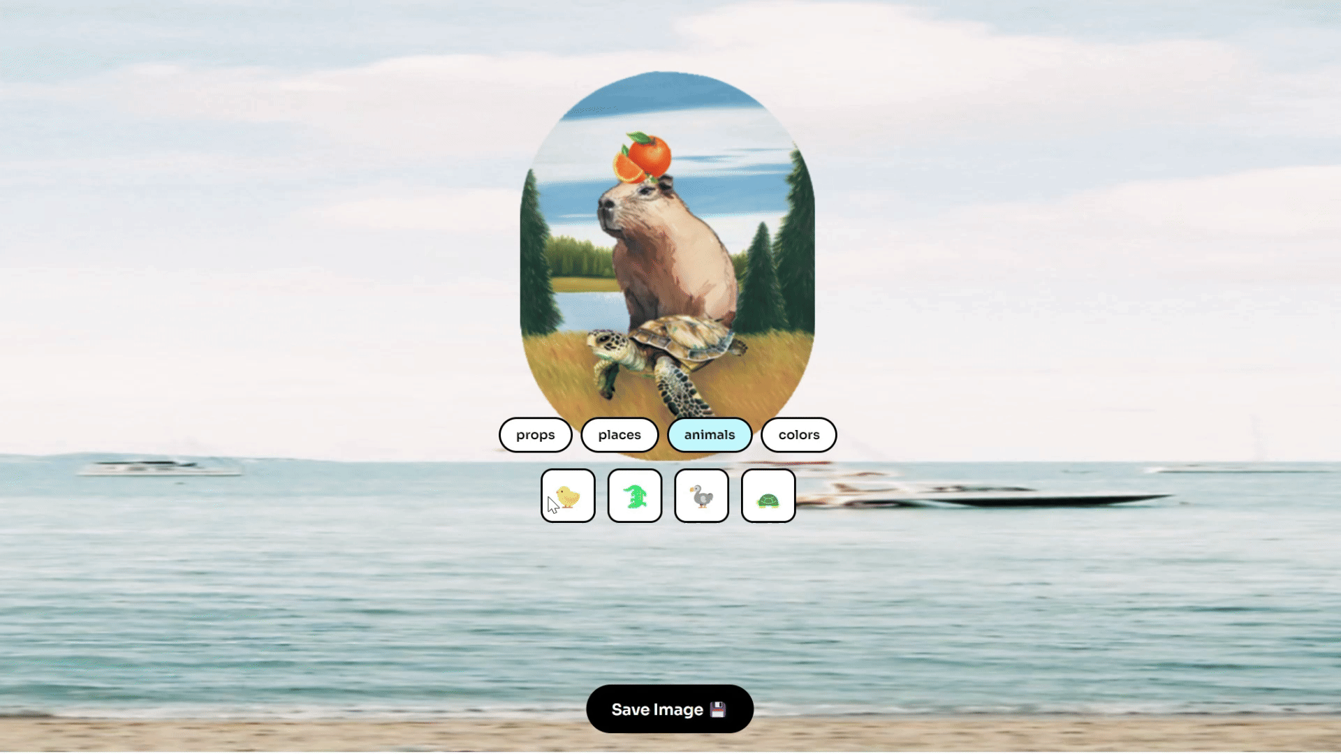 I developed this website using HTML, CSS, and JavaScript, and deployed it on Replit.com. The inspiration came from a capybara meme I encountered on the internet and various social media platforms. Capybaras are known for their amicable behavior and ability to befriend other animals. Motivated by this, I created a feature that allows users to mix and match different categories, such as places, costumes, accessories, and animals. Ultimately, users can save the images based on their design selections.