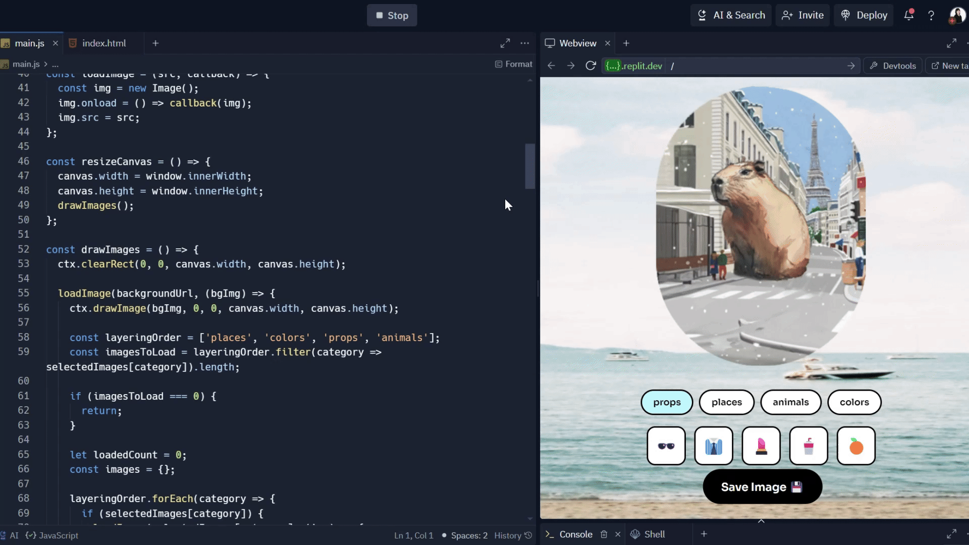 Button Interactions: Each category item (e.g., props or places) has buttons linked to specific assets. Clicking these buttons updates the selectedImages object with the new image source for that category, and the canvas is updated to reflect this choice.